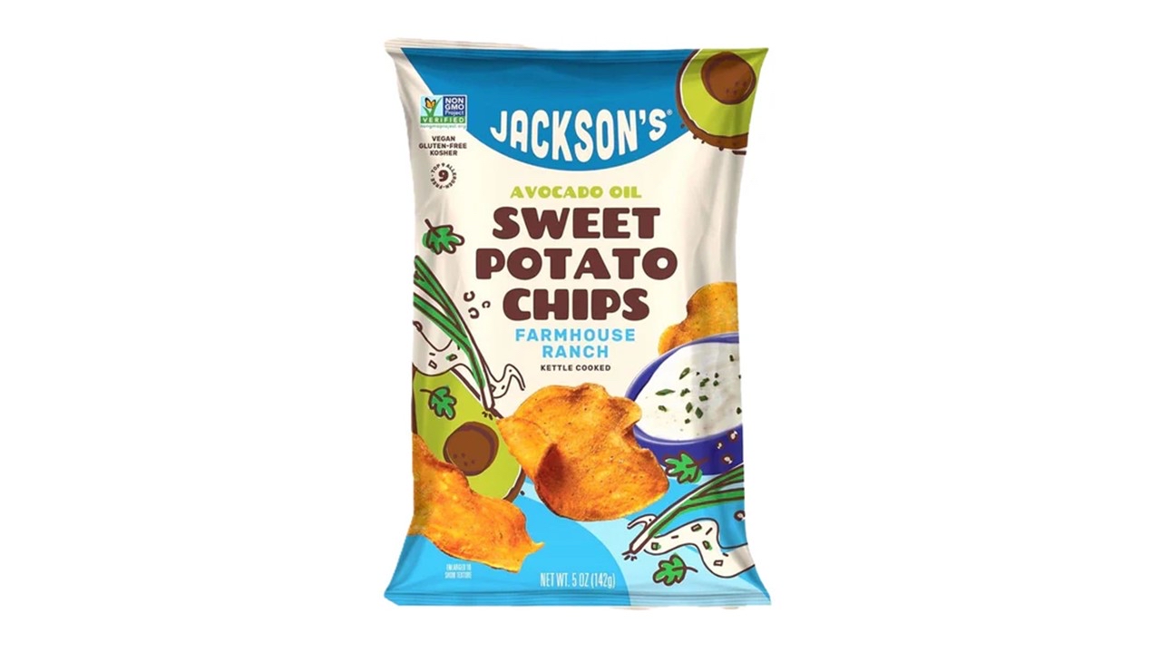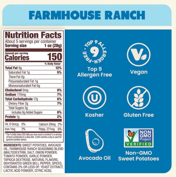 源自美國🇺🇸無基因改造改及不含麩質認證的蕃薯片,製作過程先將蕃薯擲下,去皮清洗乾淨後,砌成薄片,連同牛油果油放在焗爐內焗製而成,再加上牧場沙拉醬作調味,令味道更香濃.蕃薯片含低碳水化合物及高纖維食品,比起普通薯片低脂肪,被坊間認同為其中一款受歡迎美味健康小食.