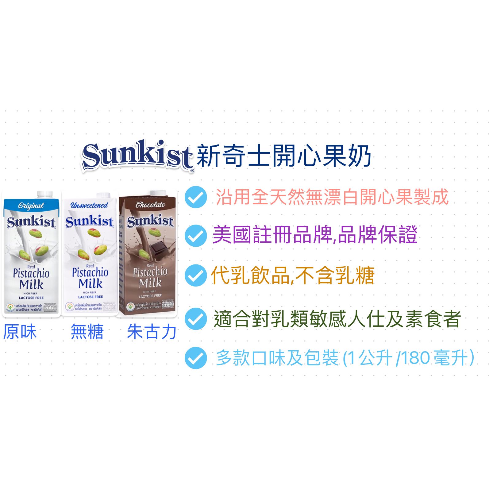 美國🇺🇸品牌新奇士原味開心果奶沿用全天然無漂白及無添加開心果製成, 含高纖維,增加飽肚感. 此外不含乳糖,適合對乳糖敏感人仕及素食者飲用. 溫馨提示:開封後放在雪櫃下格,5天內飲用